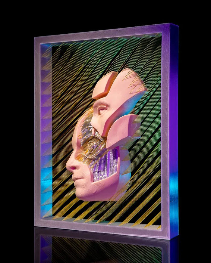The Android Wall Art explores the intersection of humanity and technology with a striking dual-faced design that blends organic expression and cybernetic structure. With fragmented features, circuit inspired detailing, and diagonal golden strands, the Android Wall Art creates a futuristic centrepiece that adds depth and thought provoking style to modern or sci-fi themed interiors.