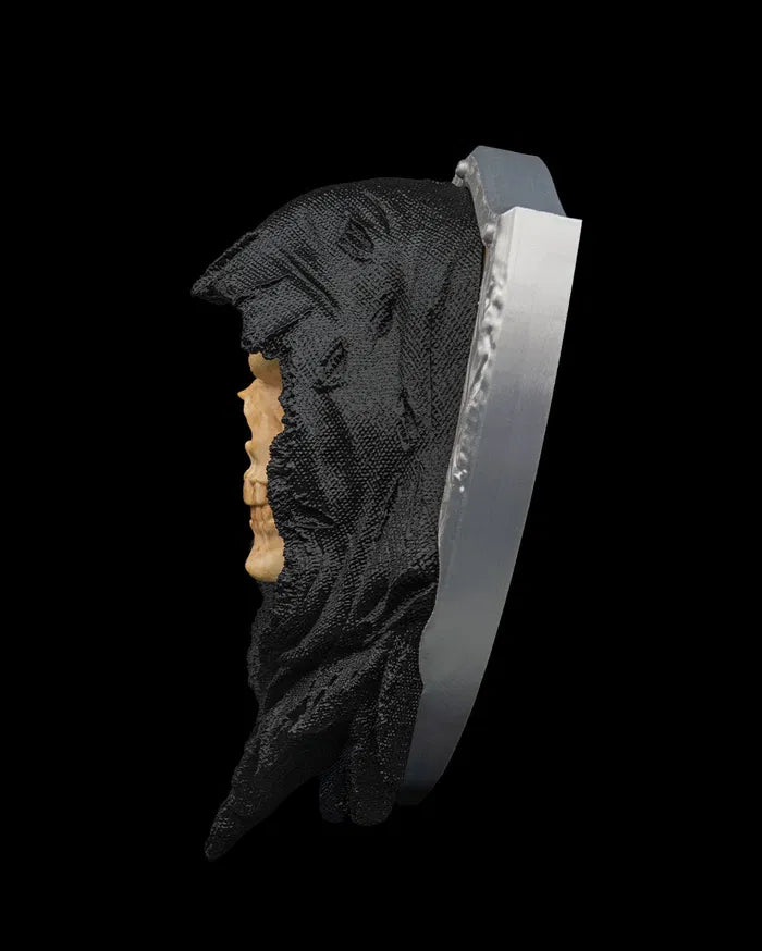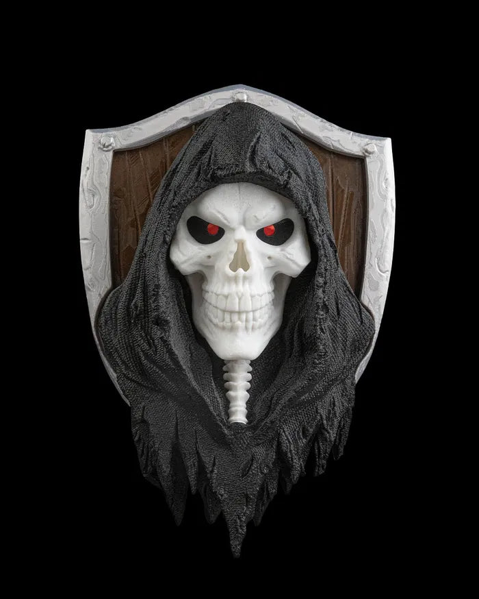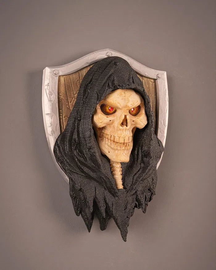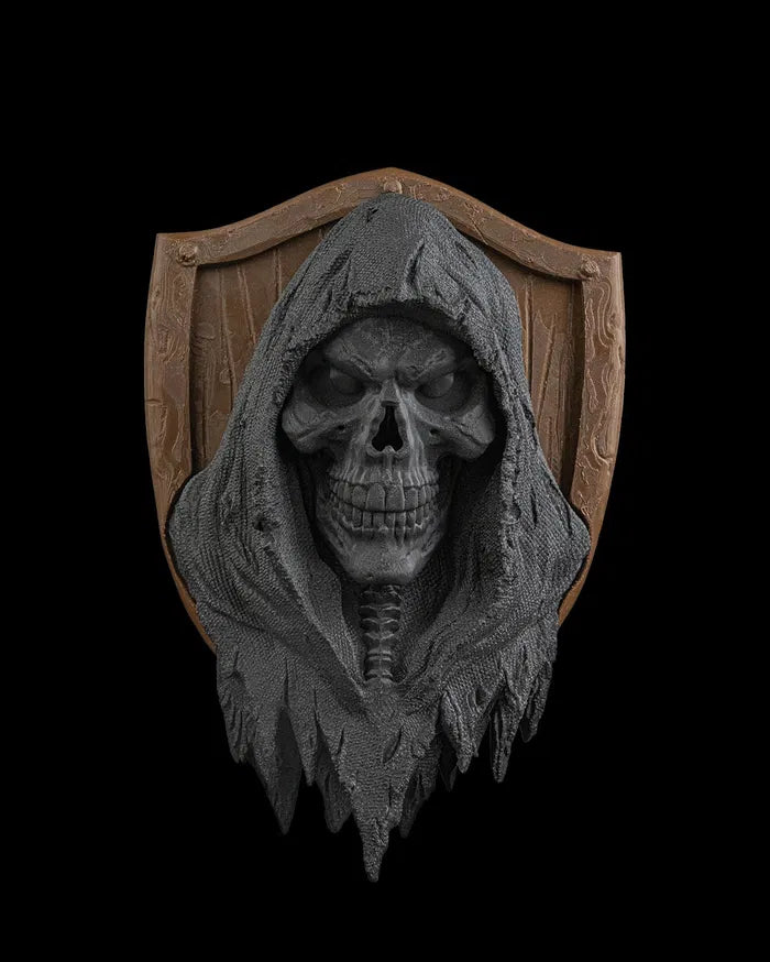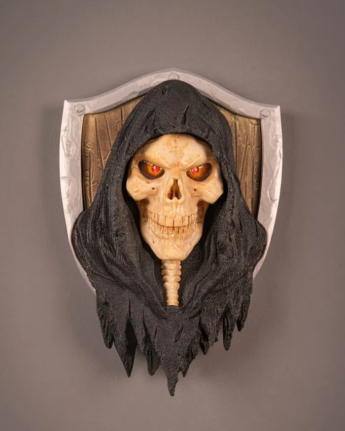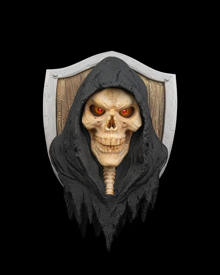 The Last Harvest Wall Sculpture captures the ominous presence of the reaper with its haunting skull visage and shadowed hooded form. Mounted against a weathered shield backdrop and accented with glowing red eyes, the Last Harvest Wall Sculpture creates a dramatic gothic focal point that adds dark fantasy character to walls, themed rooms, or collector displays.