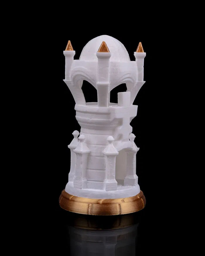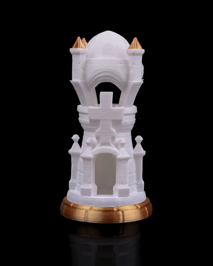 Angelic Rook stands as a beacon of divine defence. Shaped like a sacred fortress crowned with golden spires and holy arches, this celestial stronghold embodies unshakable faith and unwavering protection. A commanding piece for any fantasy chess set or holy-themed display.