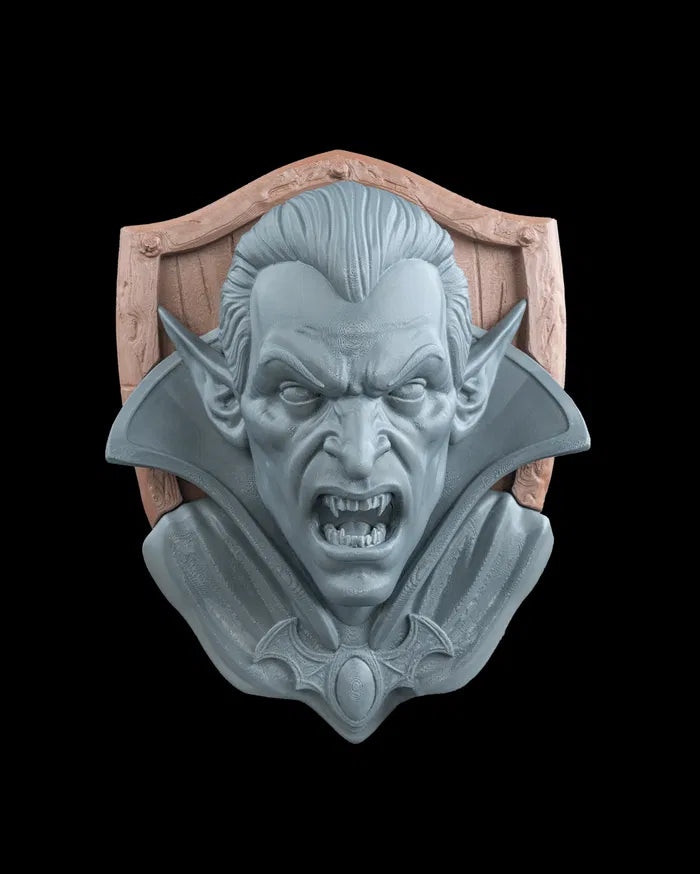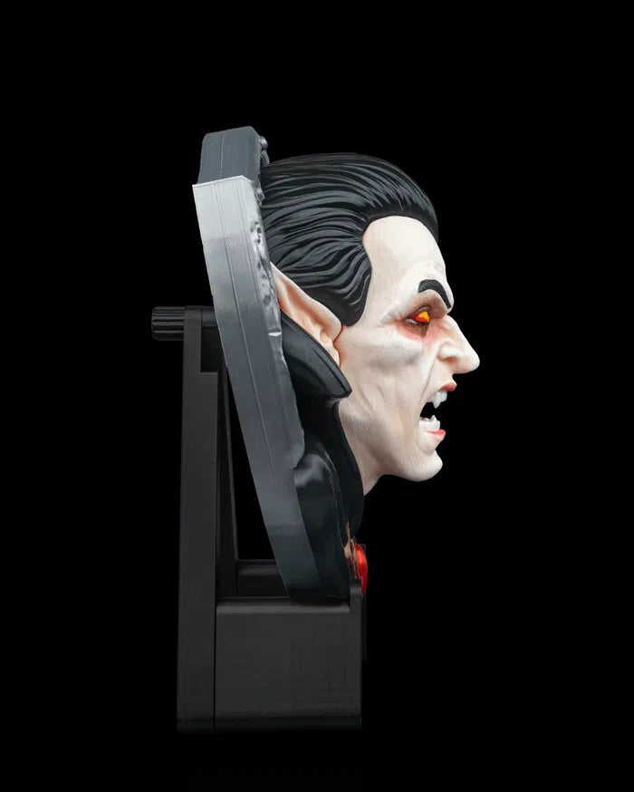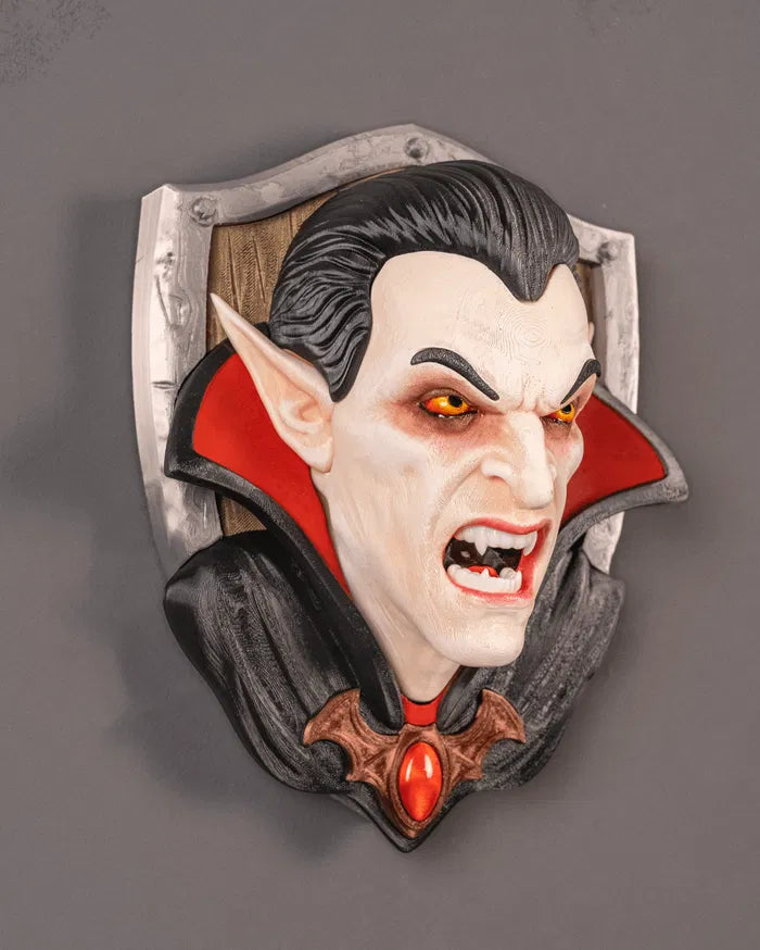 This eerie wall-mounted vampire bust captures the chilling presence of a centuries-old predator frozen mid-snarl. With its razor-sharp fangs, fiery eyes, and high-collared cape, the Head Count piece evokes the gothic essence of the undead, making it a perfect centrepiece for collectors of horror, fantasy, or Halloween décor.