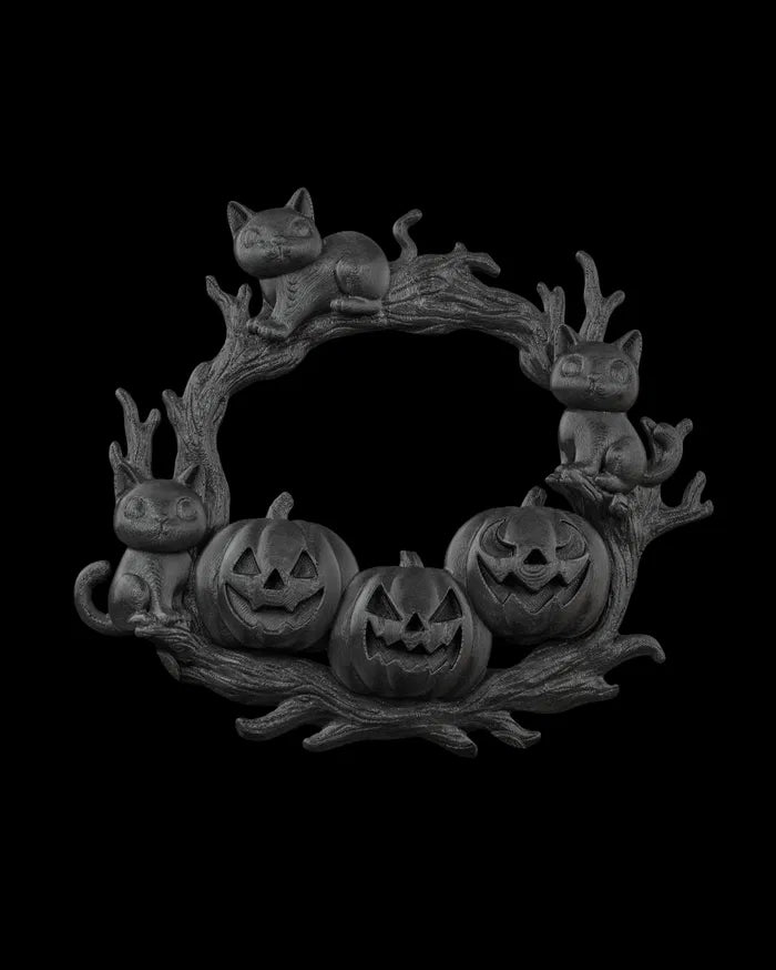 The Cozy Patch – Wreath blends Halloween whimsy with autumn charm. With playful black cats perched on twisted branches and glowing jack-o’-lanterns nestled below, it’s a warm yet spooky accent for seasonal décor.