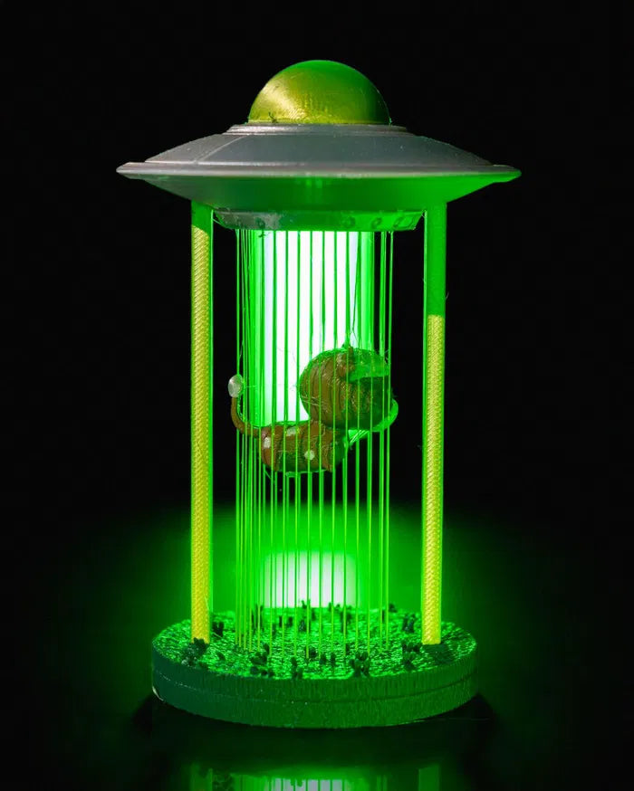 Take a light-hearted leap into the unknown with the Abduction display piece. A classic UFO beams down vibrant green rays to lift a surprised little cow mid-air, creating a fun and whimsical 3D scene perfect for alien enthusiasts and fans of the unexplained.