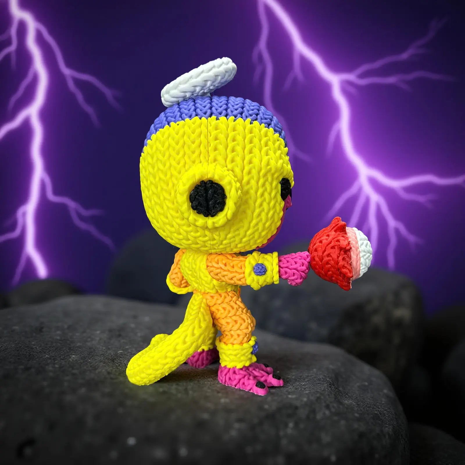 - Posed dynamically with a textured energy blast in hand, all rendered with a textile-like finish.