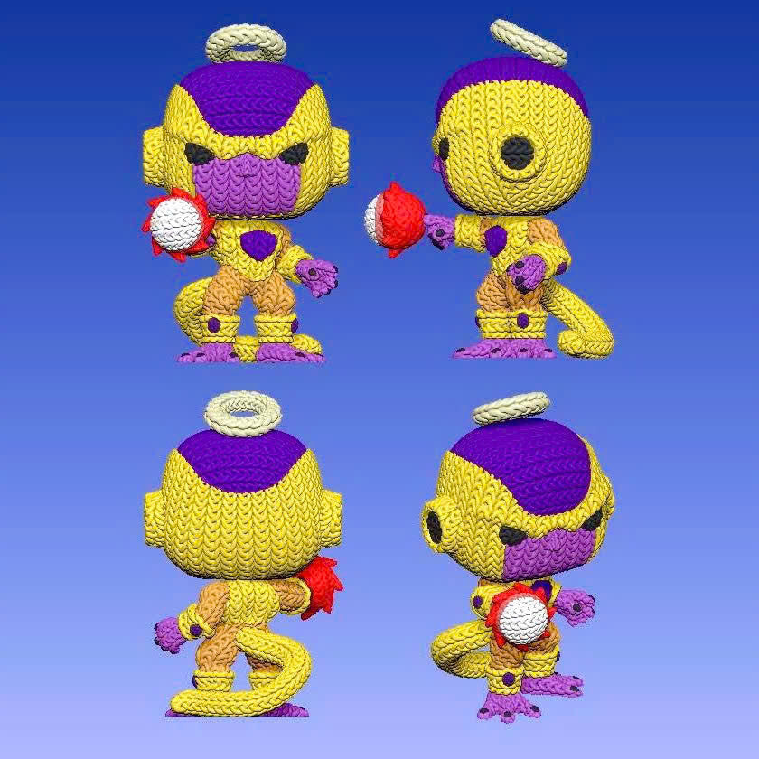 The galactic emperor reaches his ultimate evolution with a unique, artisanal aesthetic. This 3D-printed Golden Frieza figure features an incredibly detailed knitted texture, meticulously designed to replicate the look of a handcrafted amigurumi plush while capturing the character's immense power.