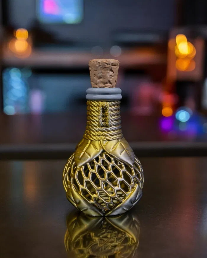 The Potion Flask Container features a fantasy-inspired flask with leaf-wrapped lattice detailing and a removable cork stopper, combining whimsical design with practical use. The Potion Flask Container adds magical charm to desks, shelves, or apothecary-style displays, making it a delightful accent for collectors, cosplayers, and fantasy enthusiasts.