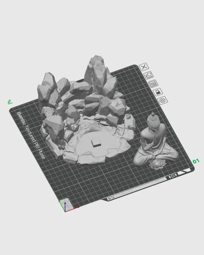- Calm and centred Buddha figure at the base