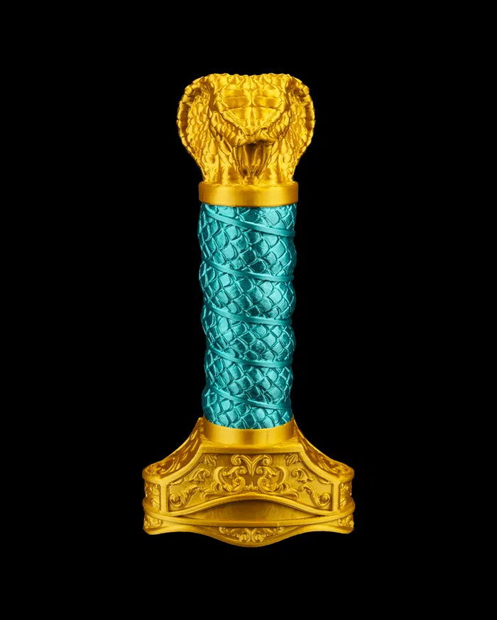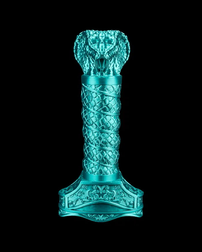 Serpent’s Coil Spiral Blade twists with hypnotic precision – a weapon that feels alive, coiled in motion even at rest. Its gleaming turquoise spiral blade and golden hilt evoke the form of a mythical serpent, balancing grace and danger in perfect symmetry. A striking piece for collectors drawn to beauty with a bite.