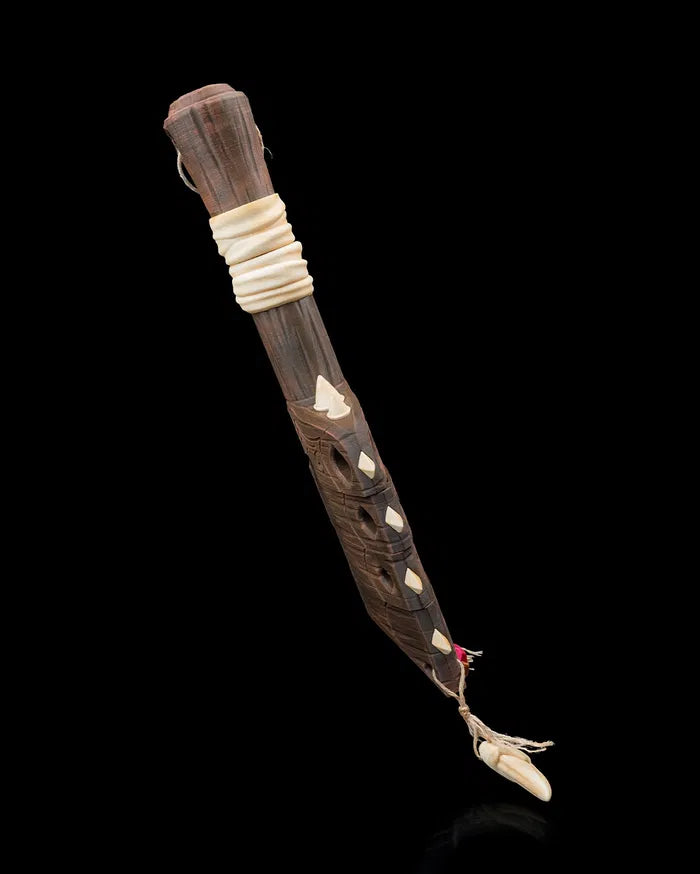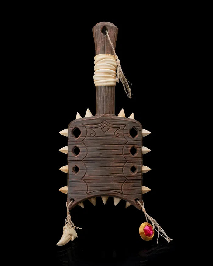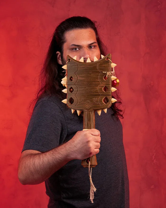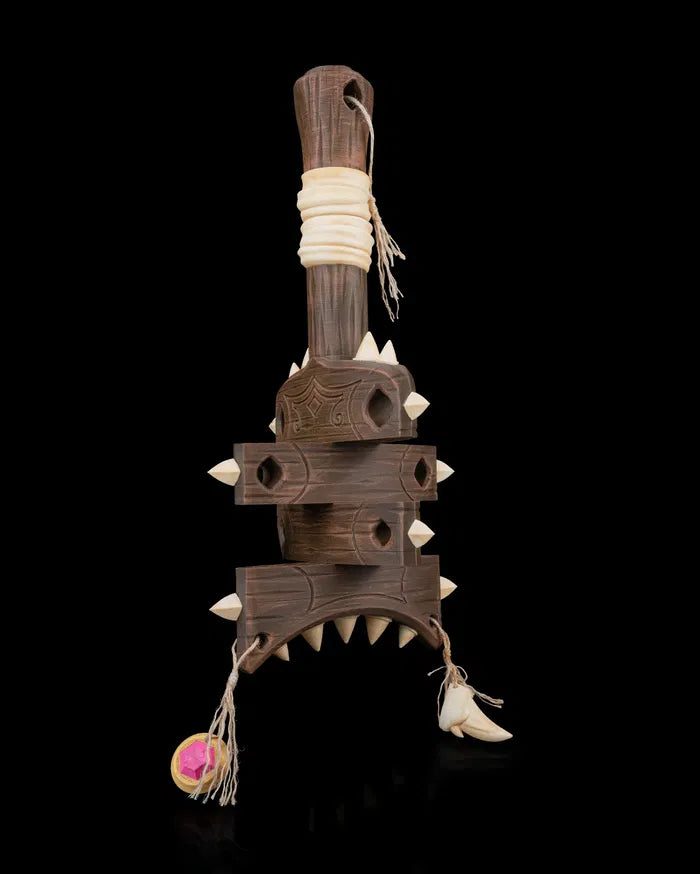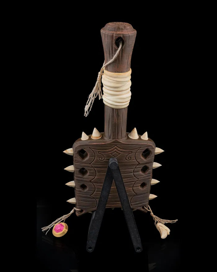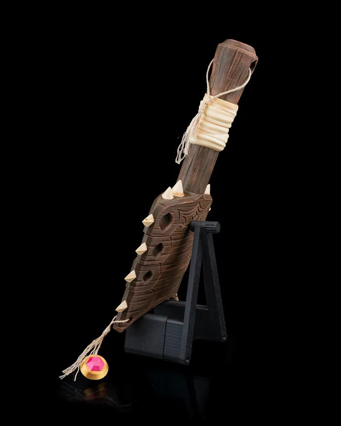The Ancestor's Bite Club channels ancient warrior energy with a brutal and primal design. Crafted to resemble carved wood and studded with jagged fang-like spikes, this fearsome weapon looks like it came straight out of a tribal legend. Complete with rope accents and detailed textures, it's perfect for those who love savage aesthetics and barbarian fantasy themes.