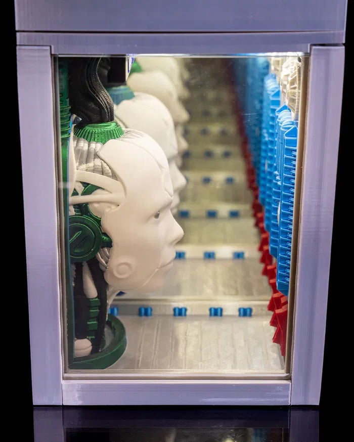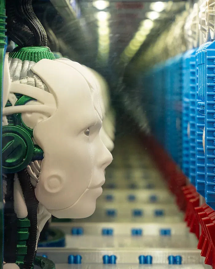 Step into the future of mass production with Android Factory—a mesmerizing scene of humanoid heads lined up in perfect, eerie symmetry. With mirrored reflections and intricate circuitry details, this piece captures the chilling beauty of automation.