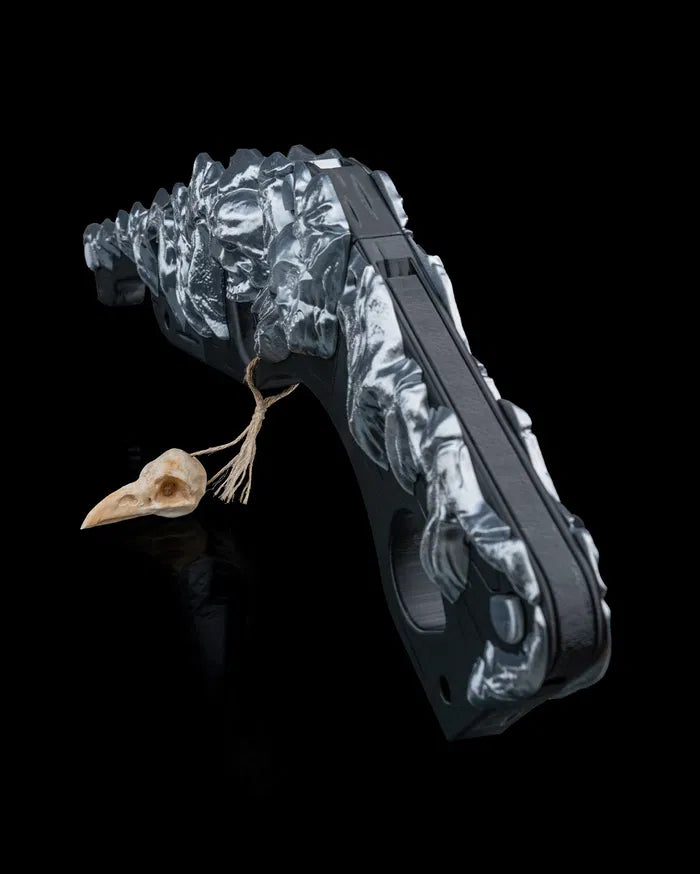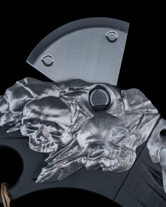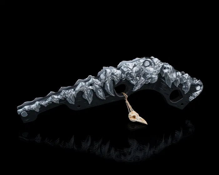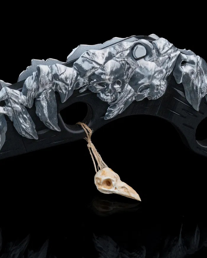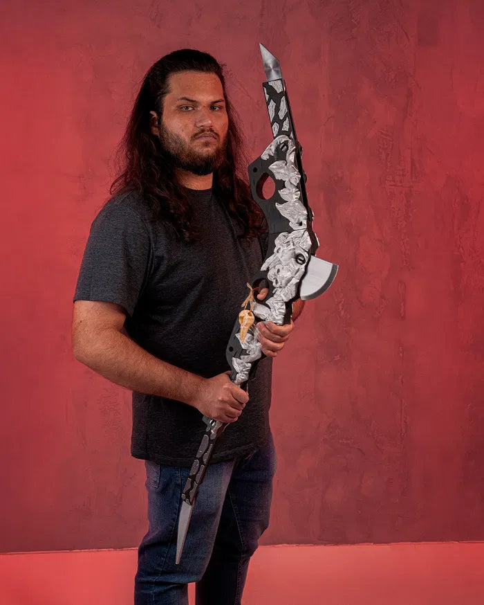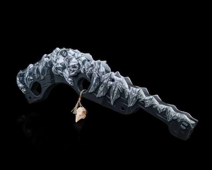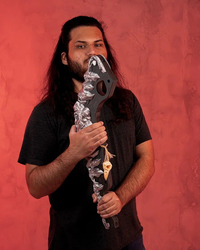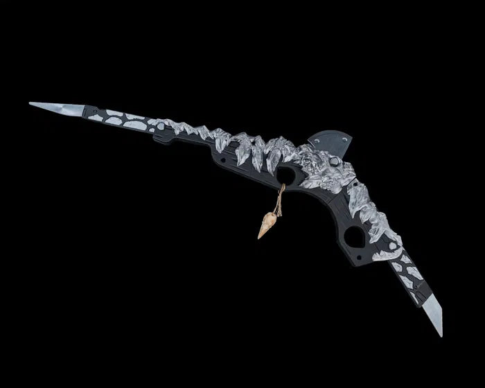 Inspired by primal power and tribal craftsmanship, the Bonebreaker Gunstock Club blends brutal design with artistic detail. Featuring a jagged, bone-like spine along a curved structure, this weapon evokes ancient strength with a modern fantasy twist. A hanging bone ornament adds eerie character, making it a striking piece for cosplayers, collectors, or tabletop roleplayers who love a fierce visual statement