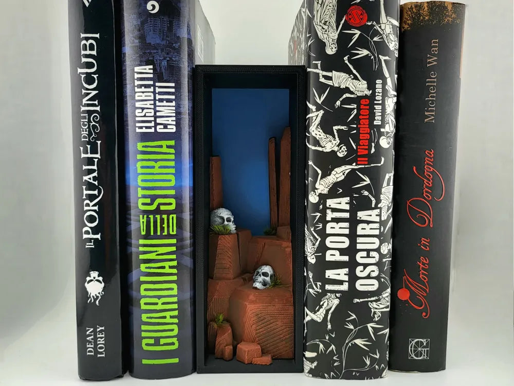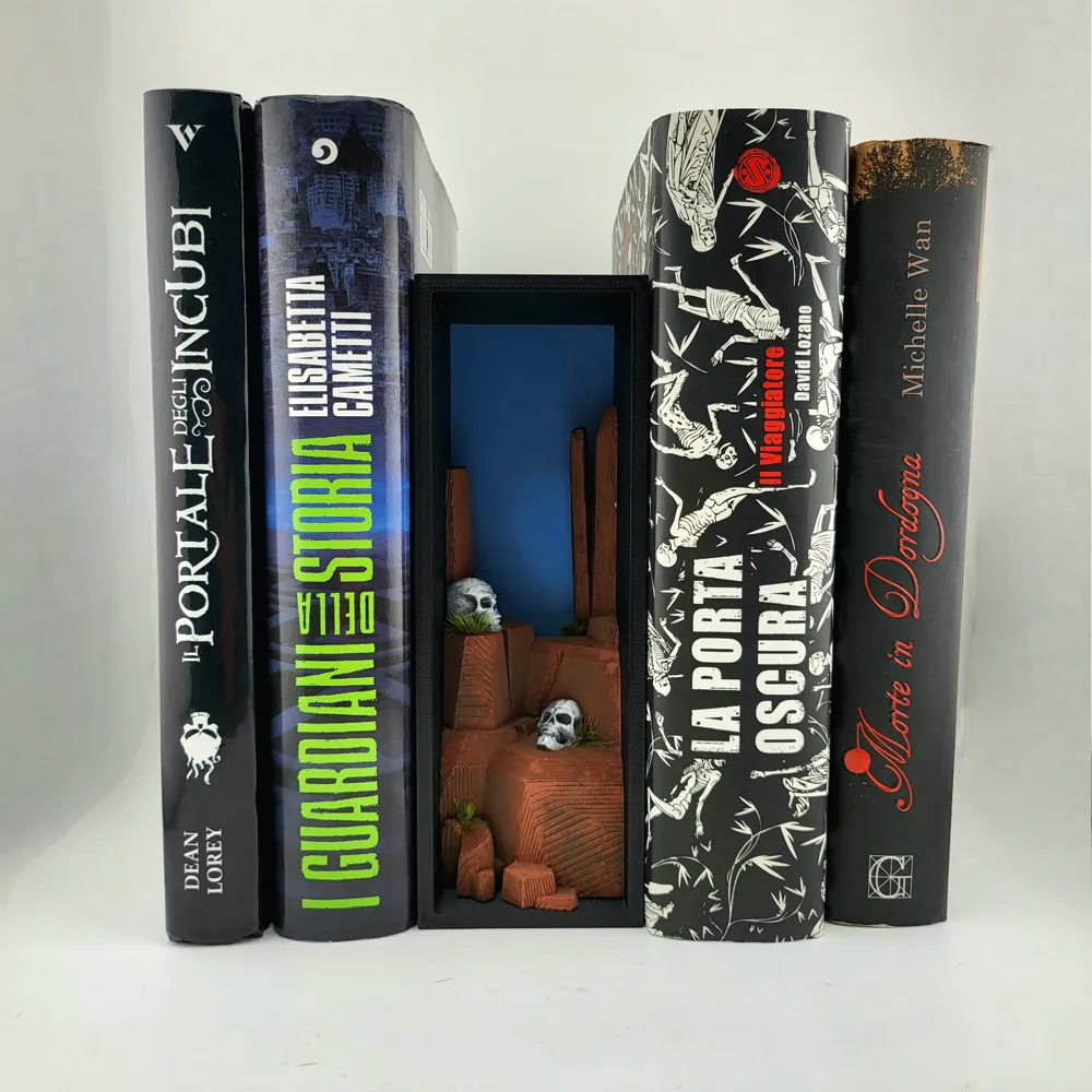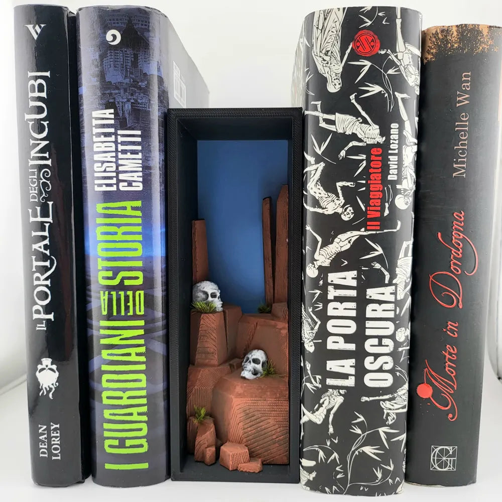 The Book Nook Desert Skull transforms your bookshelf into a mysterious canyon scene filled with rugged desert charm. Layered rock formations frame eerie skull accents while a deep backdrop adds immersive depth that draws the eye inward. The Book Nook Desert Skull fits neatly between books, creating a miniature landscape that turns any shelf into a dramatic and atmospheric display.
