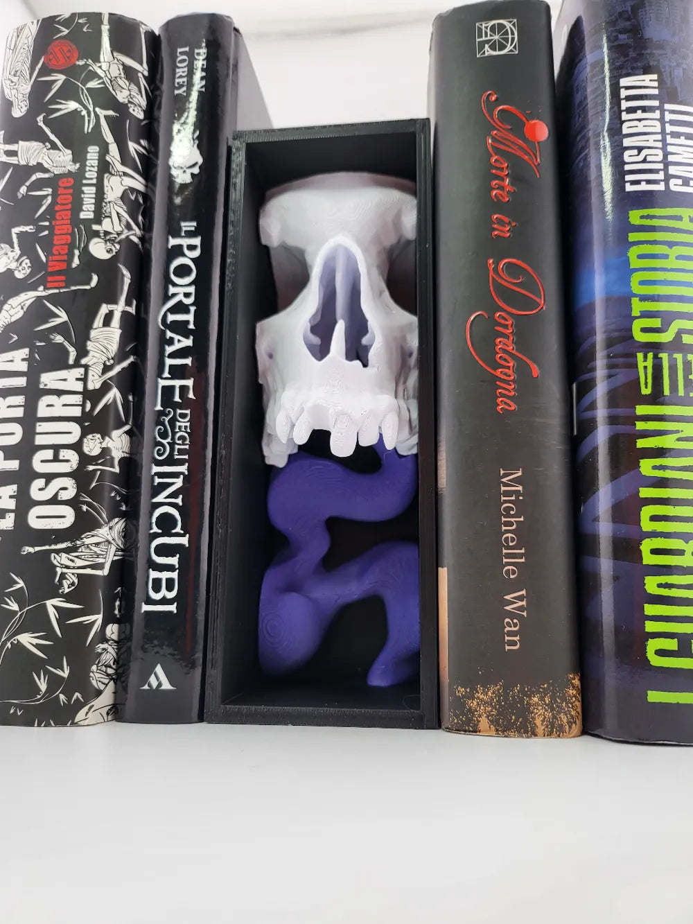 The Book Nook Smoke Skull adds a striking dark fantasy accent to any bookshelf. Featuring a tall stylized skull rising from a flowing smoke-like base, the Book Nook Smoke Skull creates an eerie and atmospheric display. Its dramatic sculpting, smooth contrasting surfaces, and compact vertical form make it perfect for themed shelves, reading corners, or creative display areas.