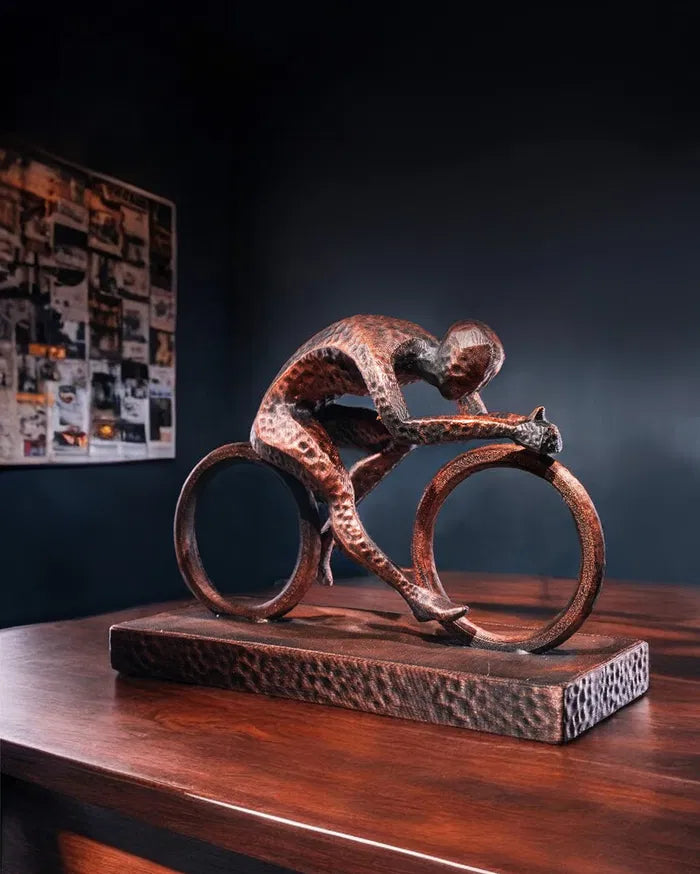 The Cycling statue captures the sleek determination of a cyclist mid-race, bent low over the handlebars in aerodynamic focus. With bold curves and a rustic bronze-like texture, this piece pays tribute to endurance, precision, and motion. A striking choice for athletes, enthusiasts, or lovers of sculptural art.