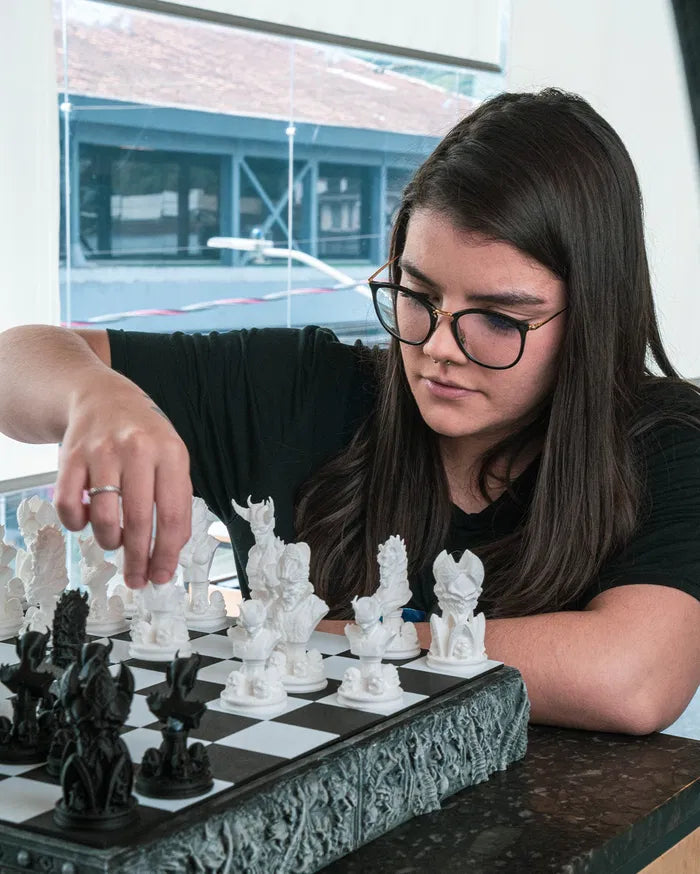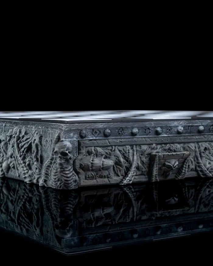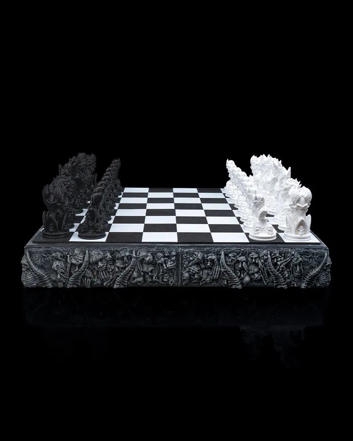 The Demonic Chess Board is a hauntingly beautiful take on the classic game, blending gothic artistry with devilish detail. With intricately sculpted demonic figures in black and white, this set transforms every match into an epic battle between light and darkness. The board base is wrapped in eerie carvings and skull-lined borders, making it just as stunning on display as it is thrilling to play.