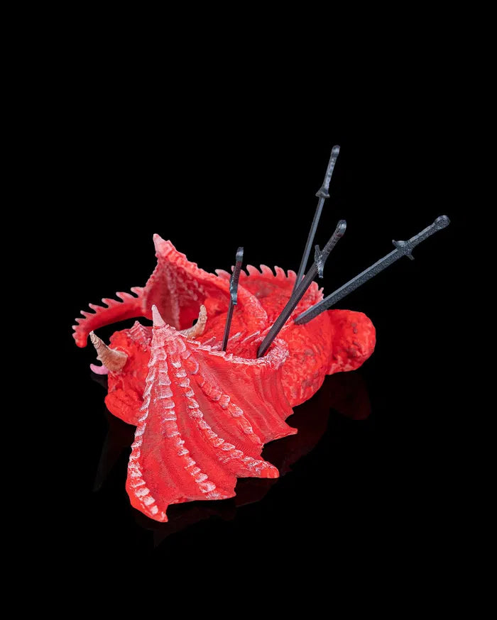 Dragon’s End – Bookmark tells a tale of bravery frozen in time, featuring a fallen red dragon pierced by swords, its final battle immortalized in miniature form. This striking piece combines fantasy artistry with practical function, making every book feel like an epic saga.