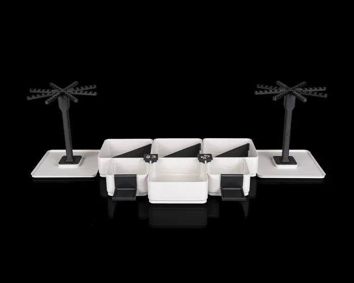 - The kit features a modular configuration including four large display trays and two smaller utility trays for varied product sizes.