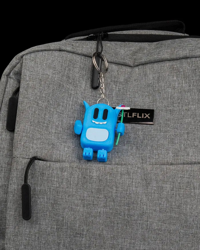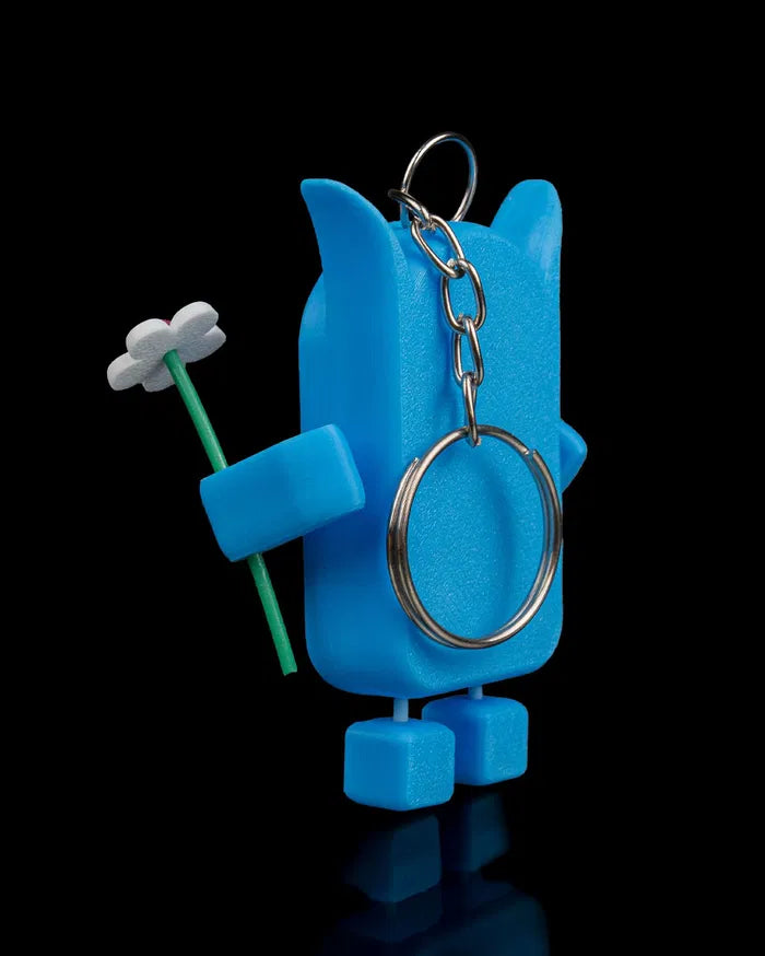 Meet the cheerful and quirky Giggle Beast, a bright blue little creature spreading smiles wherever it goes. With wide eyes, tiny fangs, and a playful flower in hand, this keychain-sized mascot is a fun companion for anyone who loves cute and happy vibes.