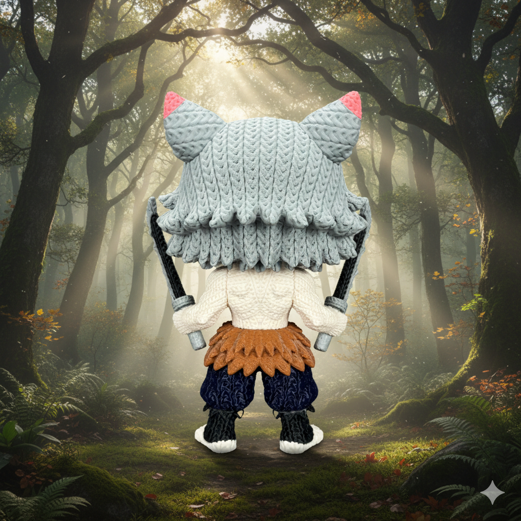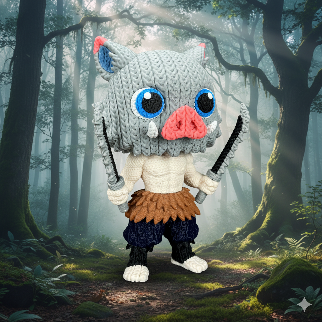 Bring the untamed energy of the Beast Breathing master to your collection with this Knitted Inosuke figure, a masterfully designed model that captures the raw intensity of Demon Slayer with a cozy, handcrafted aesthetic. This unique piece features a hyper-realistic 3D texture, meticulously crafted to resemble the intricate, interlocking loops of traditional amigurumi crochet.