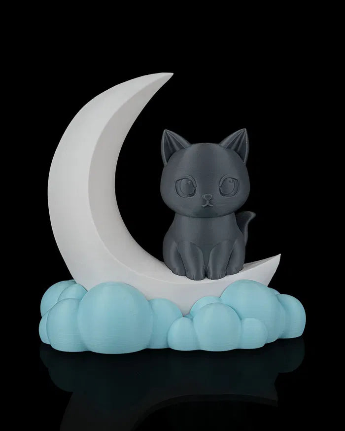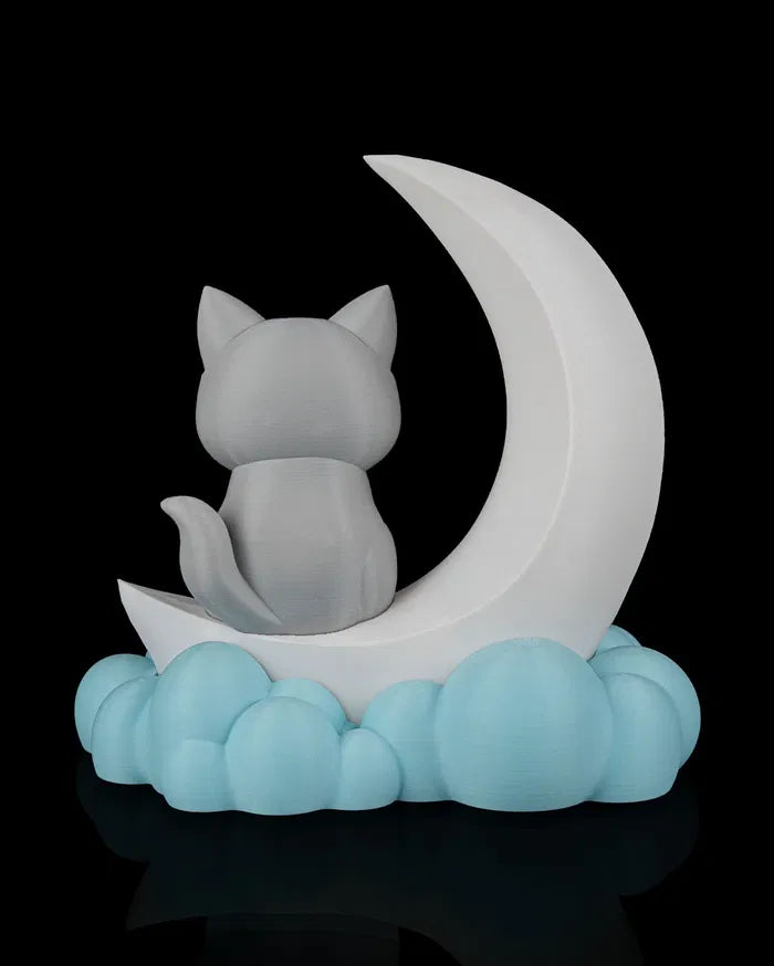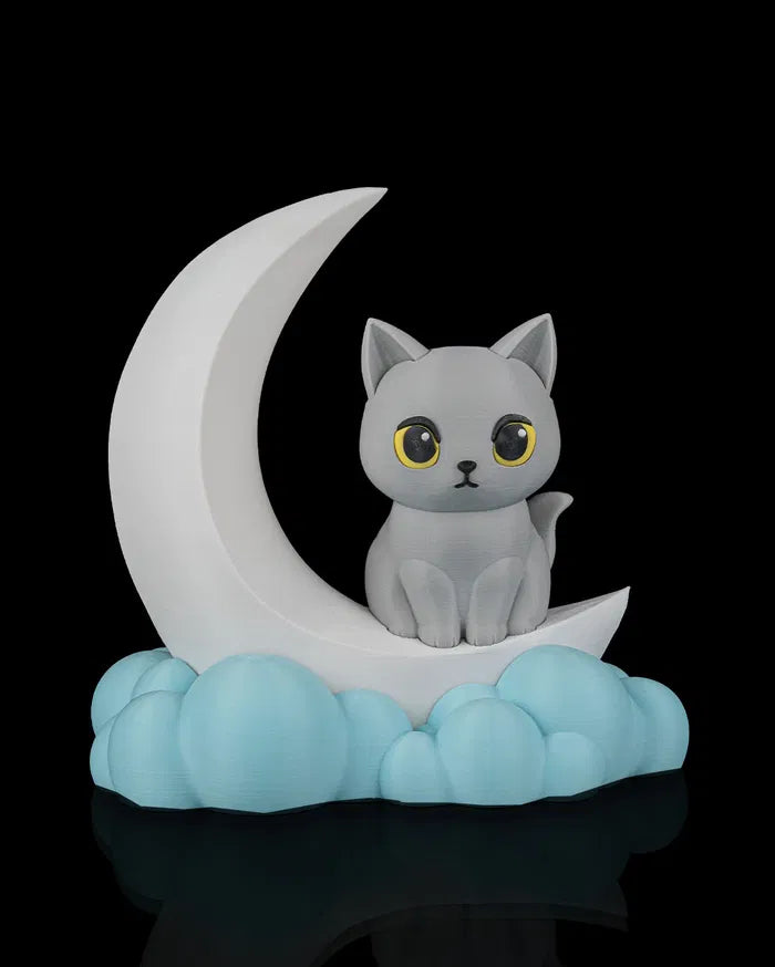 - Cat and Moon Design: Curious grey cat seated on a glowing crescent moon creates a magical scene.
