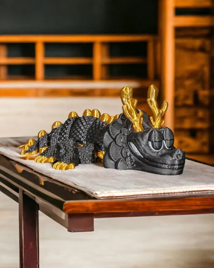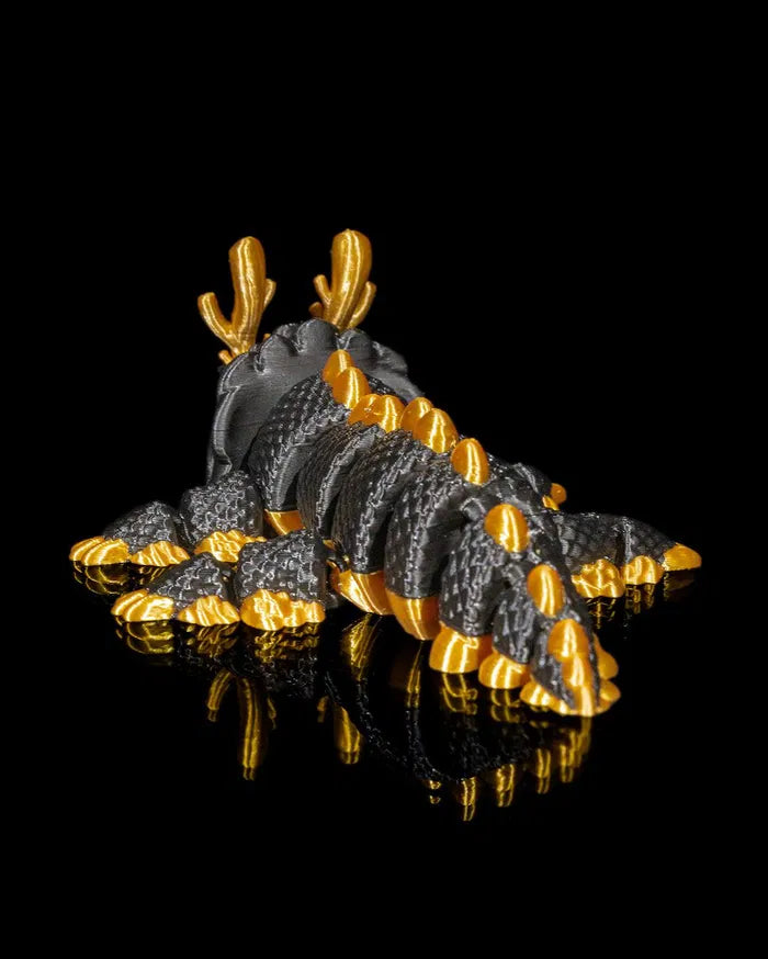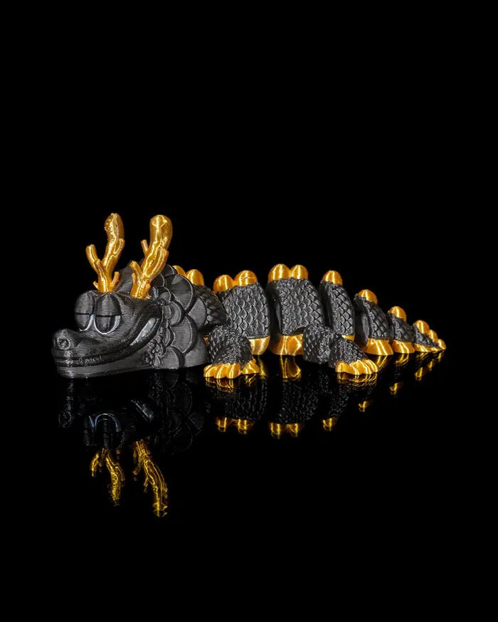 Compact but full of character, the Mu Long Zai is a majestic miniature dragon in black and gold. Its calm expression and intricate golden horns give it an air of nobility — a powerful presence in a smaller, charming form.