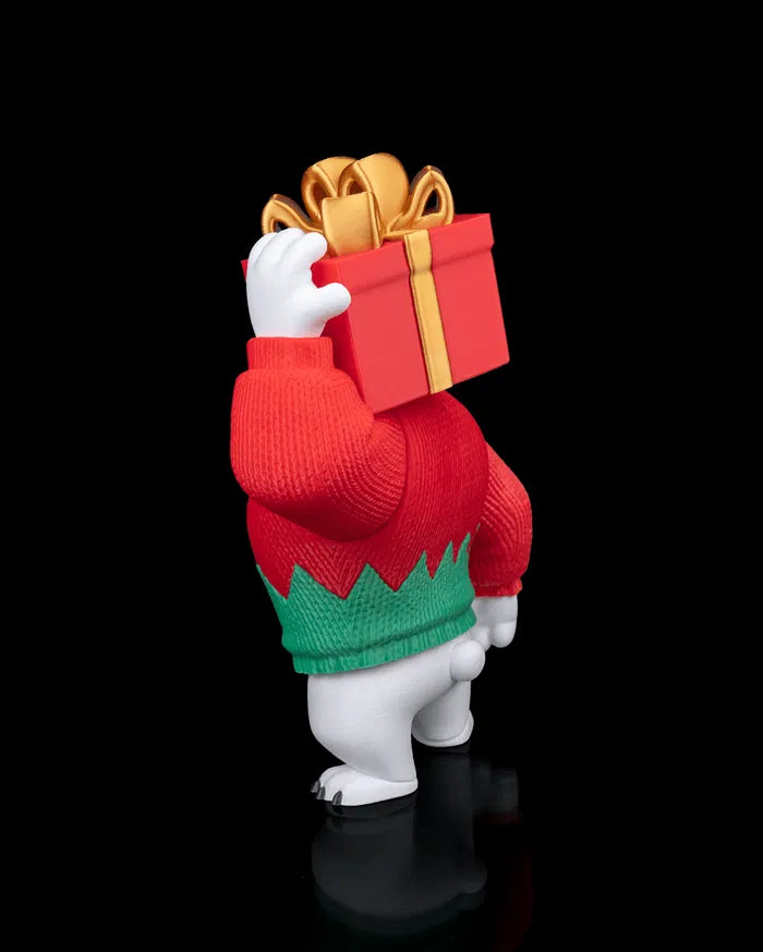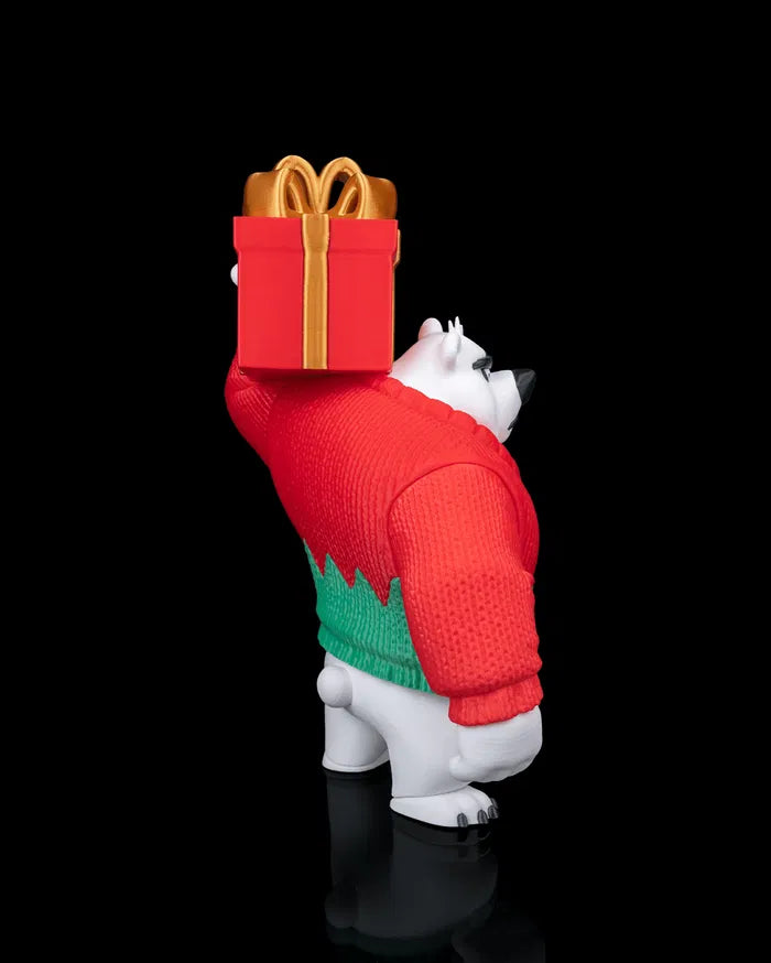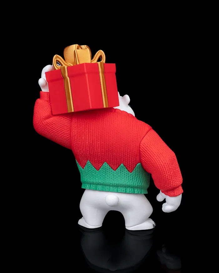 Polar Bearer stands strong with a determined expression and a powerful stance, carrying a wrapped gift high above his shoulder. This 3D printed figure features a chunky, solid form with a textured sweater design that adds depth and visual interest. The bold red and green outfit contrasts sharply against the white body, making the character stand out clearly on display.