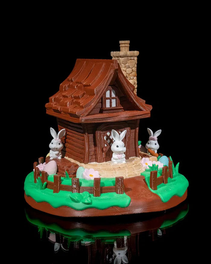 Step into the serene world of woodland whimsy with the Rabbit Cottage, a peaceful little hideaway where bunnies gather and stories begin. With a cozy log-style home, curious rabbits, and gentle greenery surrounding the scene, the Rabbit Cottage brings fairytale charm to shelves, desks, and spring-themed displays.