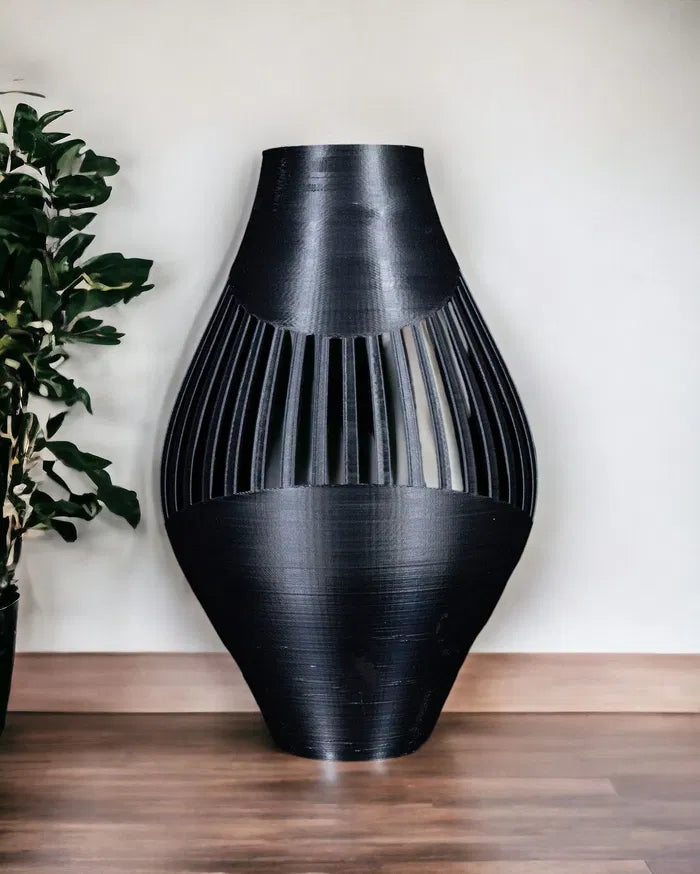 The Rinex Vase features flowing curves and clean vertical slats, combining elegant form with striking contrast. The Rinex Vase adds sophistication to shelves, tables, or windowsills, whether displaying fresh flowers, dried stems, or standing alone as a modern accent.