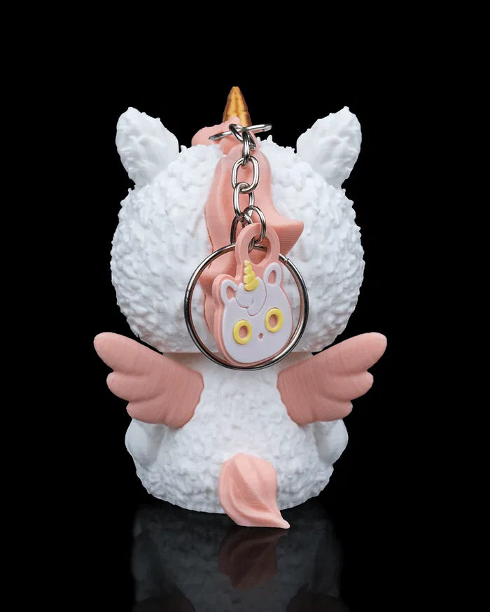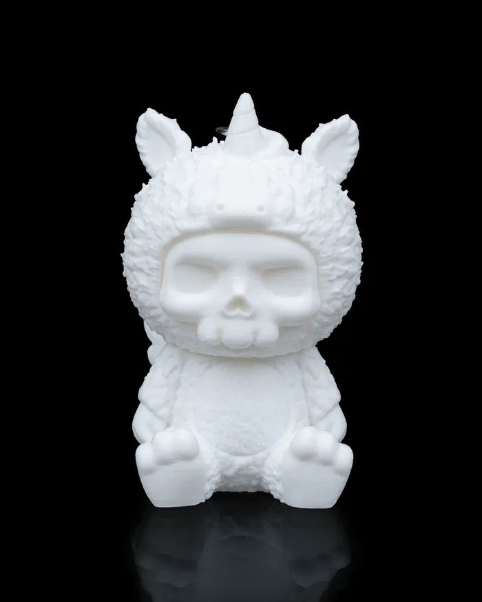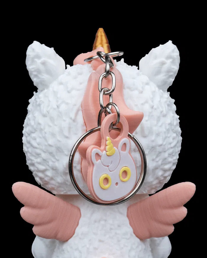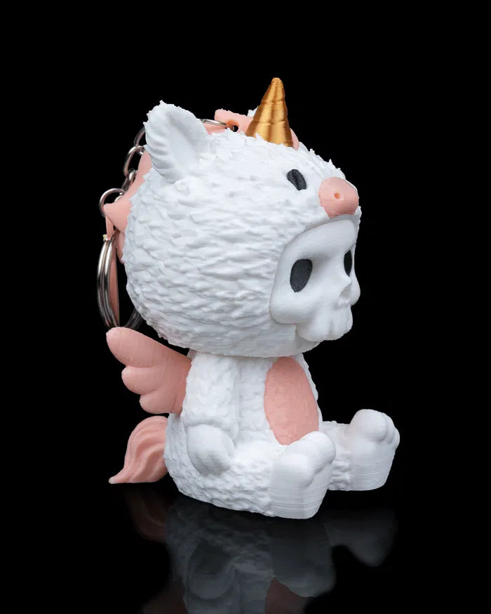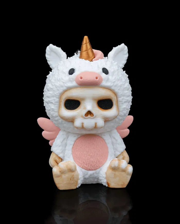 Wrapped in fluff and fantasy, Unna is the magical misfit of the Skubbies bunch. With a golden horn, pink wings, and an expressionless skull, this unicorn isn’t here to grant wishes—unless they’re weird ones.