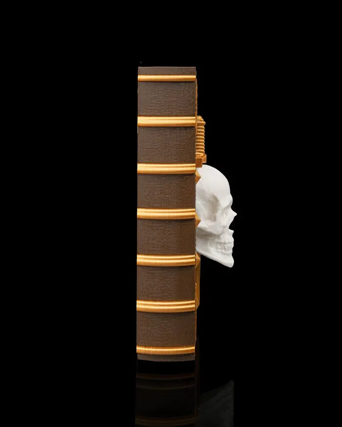 The Slayer’s Codex Dice Box & Tray is designed like a forbidden tome, blending dark fantasy style with tabletop utility. Its cover features a striking skull impaled by a golden sword, framed with ornate corners and studded accents. Inside, it transforms into a dice tray, making it both a dramatic display piece and a functional gaming accessory.