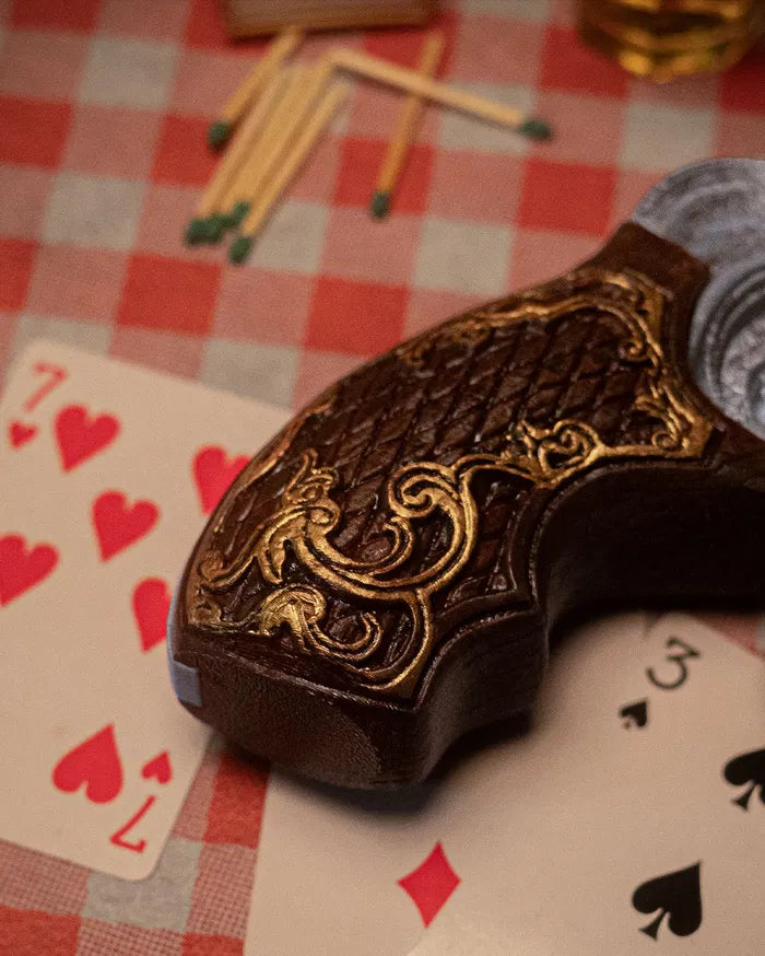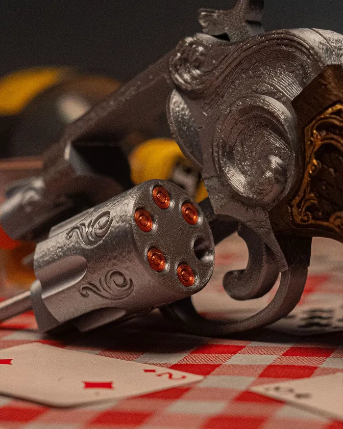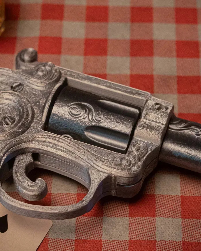- Detailed 1902 revolver design with engraved silver-tone metal