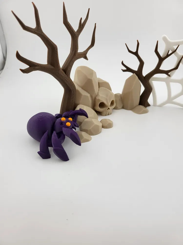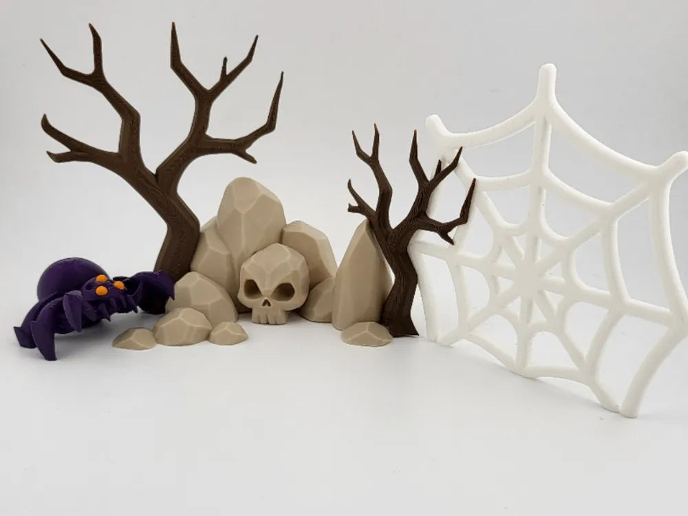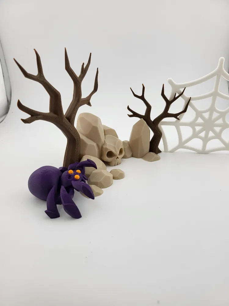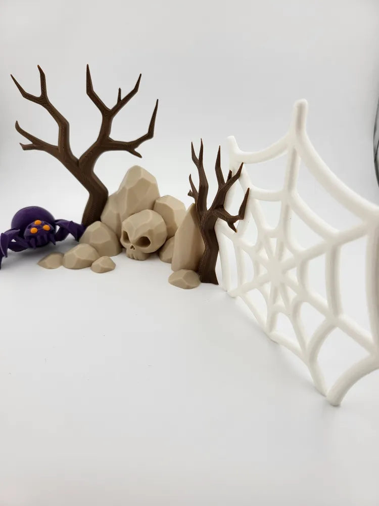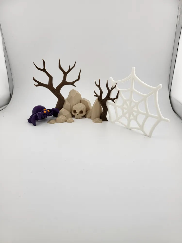 The Spooky Spider Web Graveyard Diorama brings a haunted, atmospheric accent to any display. Featuring skulls, barren trees, and a detailed spider web, the Spooky Spider Web Graveyard Diorama combines eerie charm with artistic design. Its precise 3D-printed construction and lightweight form make it ideal for shelves, desks, tabletop scenes, or Halloween décor.