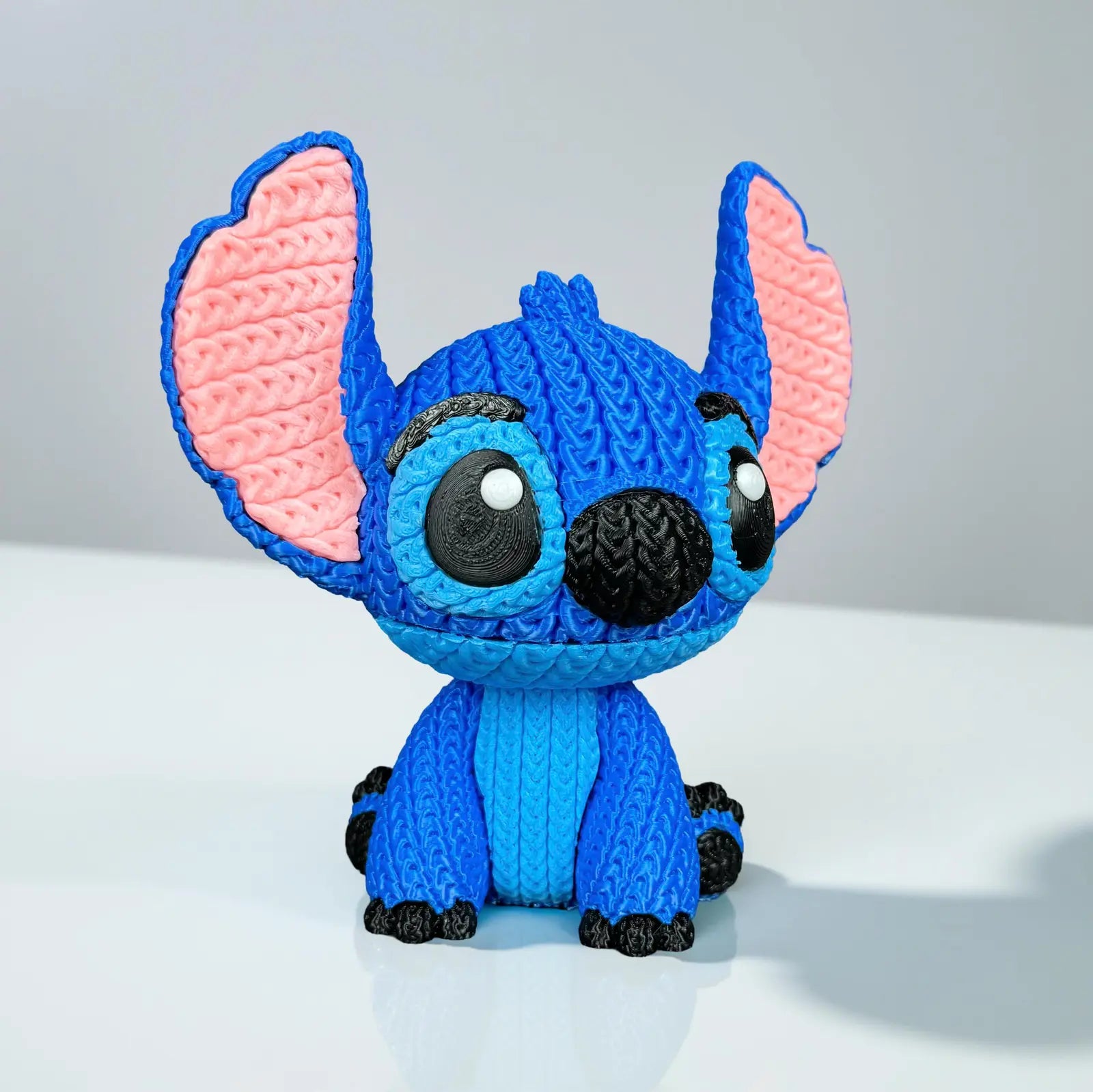 Bring a touch of cosmic charm to your desk with the sitting version of the Stitch Knitted figure. This 3D-printed model captures Experiment 626 in an adorable seated pose, featuring a highly detailed knitted texture that emulates the look of a handcrafted amigurumi plush.